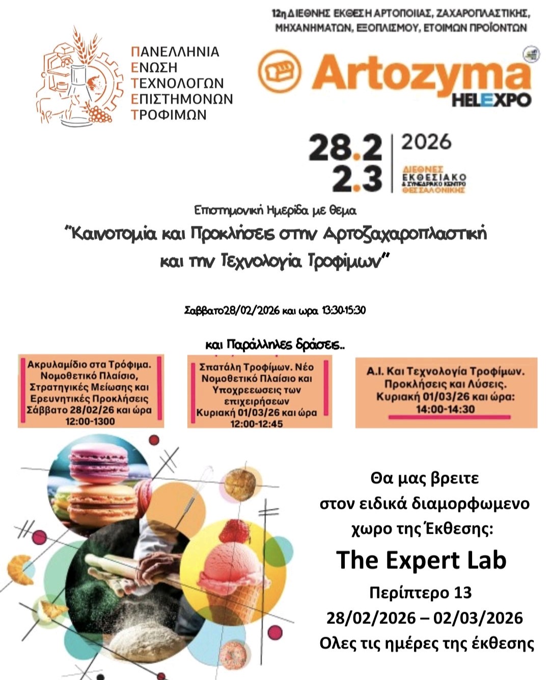 Παρόν το Τμήμα Επιστήμης και Τεχνολογίας Τροφιμων του ΔΙΠΑΕ σε μια ακόμη Artozyma Expo στο πλαίσιο εκδηλώσεων της ΠΕΤΕΤ σε θέματα αιχμής της Αρτοβιομηχανίας και Ζαχαροπλαστικής.